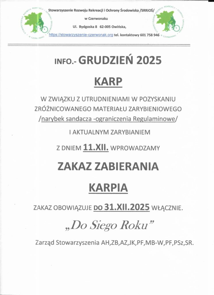 ZAKAZ ZABIERANIA KARPIA DO 31.12.2025